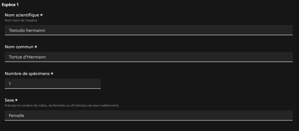 C’est LE moment crucial. Prenons comme exemple la Tortue d’Hermann. Voici comment remplir cette section :